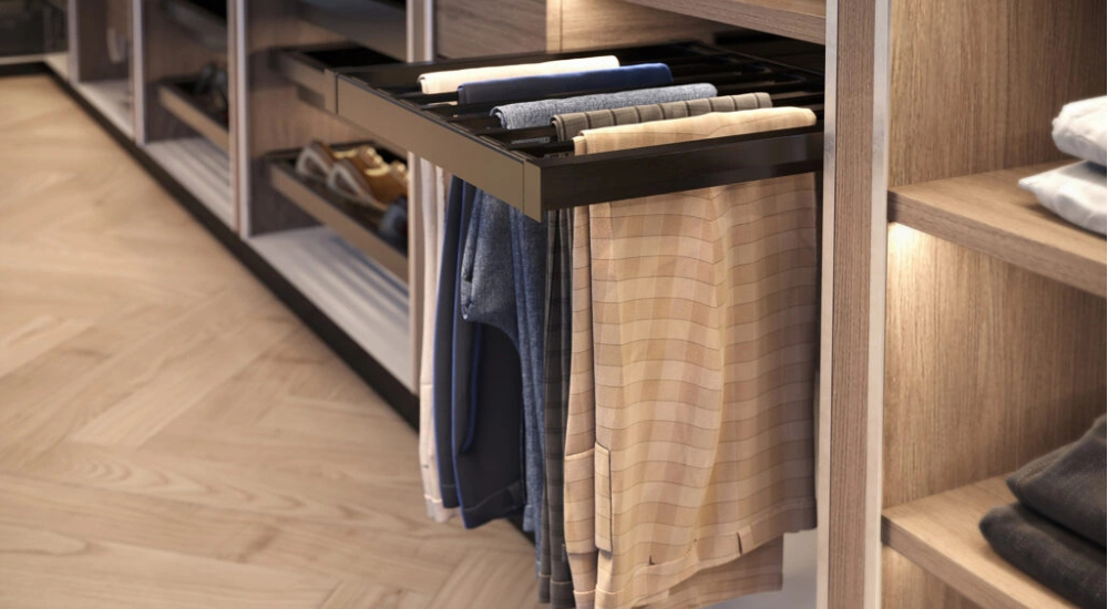 Izvlačne police za pantalone predstavljaju mali dodatak koji pravi veliku razliku. Unapređuju organizaciju, štede prostor, čuvaju garderobu i donose elegantan izgled garderoberu.